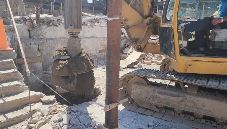 Con la colocación de los últimos pilotes, se completó una fase clave de la obra: en total serán 112 pilotes los que conformarán las columnas del futuro edificio. Para esta tarea se utilizó una máquina pilotadora de rotación de casi 25 toneladas, que permitió realizar las perforaciones necesarias.