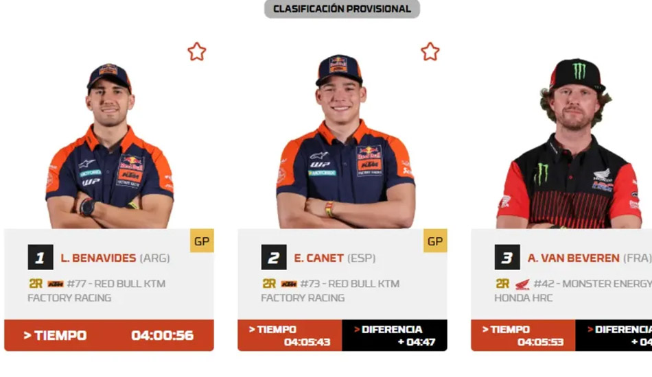El resultado fue demoledor. Benavides le sacó casi cinco minutos al francés Adrien Van Beveren (Honda) y 4 minutos 47 segundos a su compañero de equipo, el español Edgar Canet. El australiano Daniel Sanders, líder de la general, terminó cuarto, condicionado por la obligación de abrir pista, y vio cómo su ventaja se achicaba de manera preocupante.
