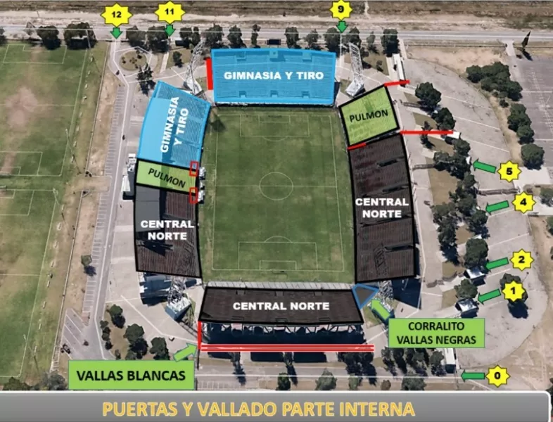 Los hinchas de Gimnasia y Tiro se ubicarán en la tribuna norte, tanto en plateas como en populares, mientras que los simpatizantes de Central Norte ocuparán el sector sur, incluyendo plateas, populares y las tribunas ubicadas sobre avenida Tavella.