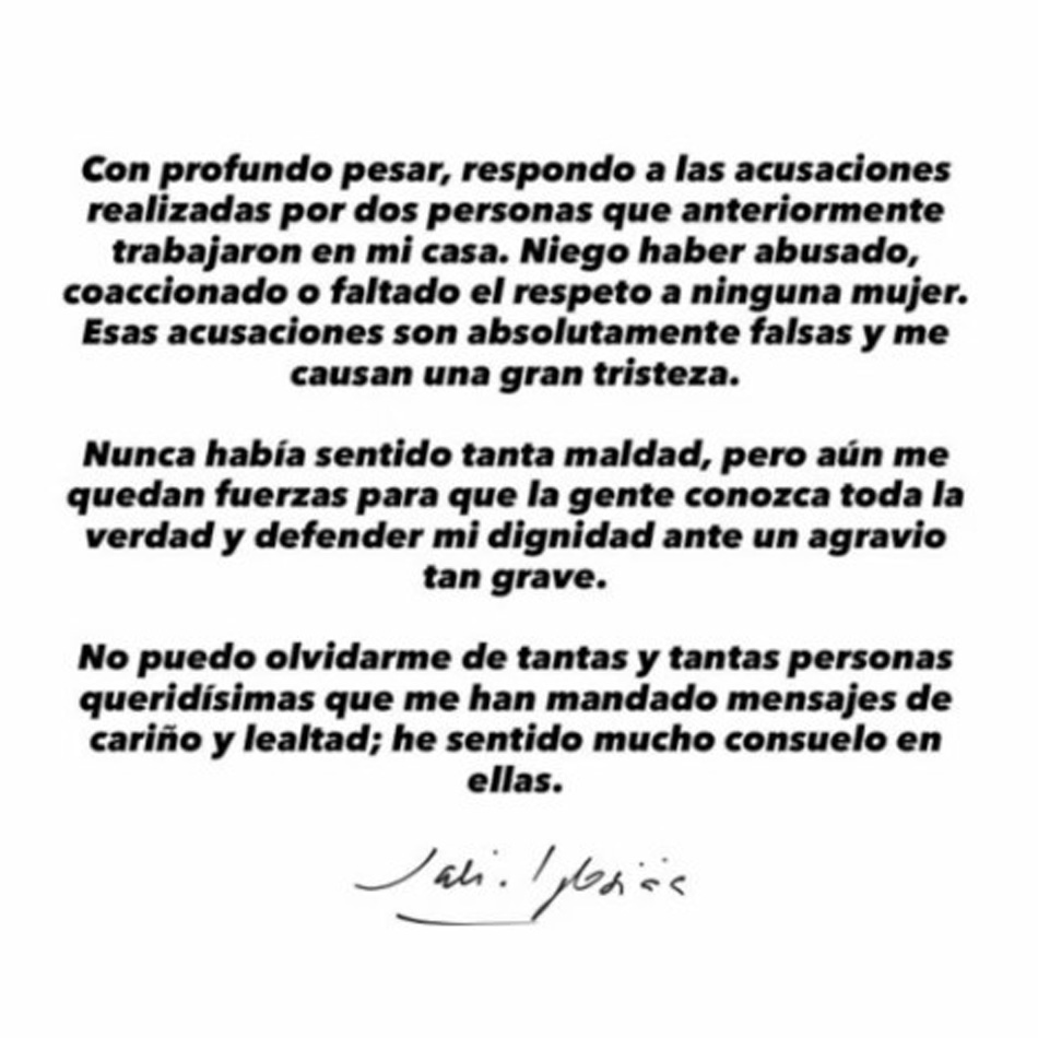 En el escrito, el artista aseguró que las acusaciones “son absolutamente falsas” y afirmó no haber abusado, coaccionado ni faltado el respeto a ninguna mujer. Además, expresó su tristeza por la situación y sostuvo que defenderá su dignidad ante lo que considera un agravio grave.